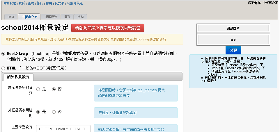 吴老师好,将tadtools一路更新到2.33,tad_themes更新到3.0,在后台对tad_themes进行设定时不知到如何分栏?原来2.8后台管理和3.0的管理界面差别太大了(如下图),没有栏数设定,没有上传滑动图片设定等等,不知道是不是我安装的问题。谢谢!