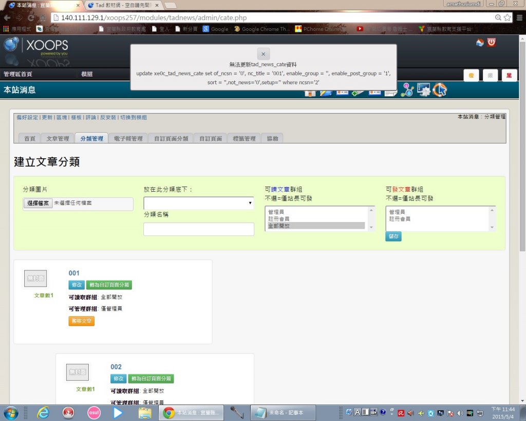 這幾天一直想辦法克服文章分類無法新增的問題,偶然測試發現從前台畫面直接輸入分類居然可以新增,但是到後台就完全不行新增分類,試圖從後台改變分類名稱或是想刪除都會失敗。附上錯誤訊息請老師幫忙看看是資料庫的問題還是有其他地方有錯