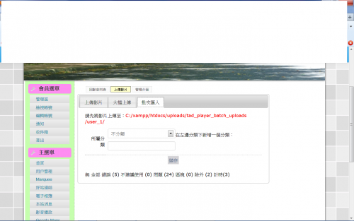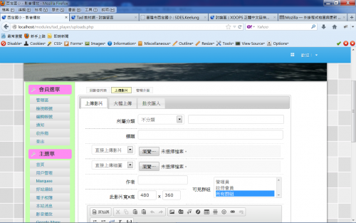 小弟在裝tad player模組後(網站內最新版的),到前台點選「上傳影片」,在最左邊上傳影片頁籤中想用youtube連結來省空間,但是畫面可選「youtube連結」,但是沒有地方能貼連結,整個畫面變得和2.5.x書上都不一樣,感覺整個框架都怪怪的,什麼「所屬分類」、「標題」、「作者」、「此影片寬x高」、「可見群組」什麼都全都不見了,最下面正中間的「儲存」跑到最右邊且被消掉三分之一…附上錯誤訊息,請教這是為何??先謝過了。