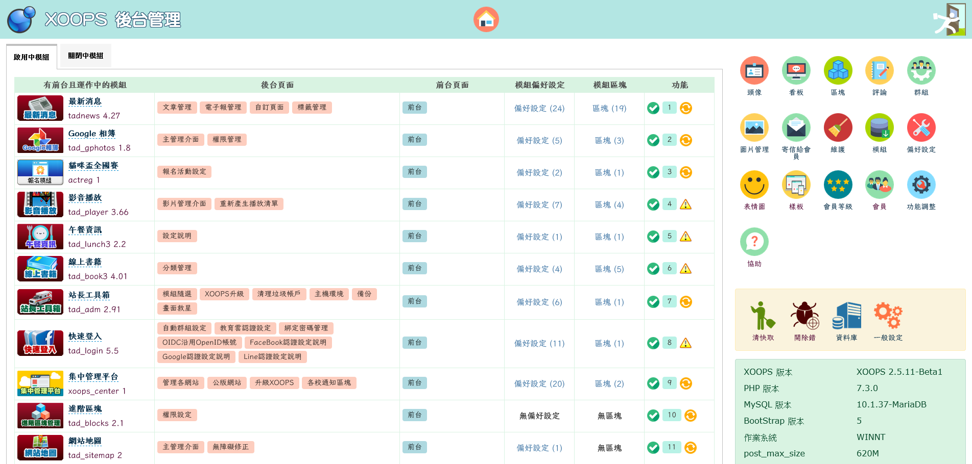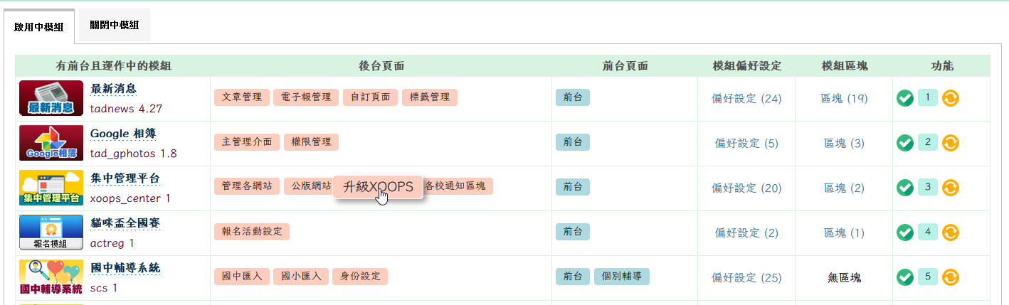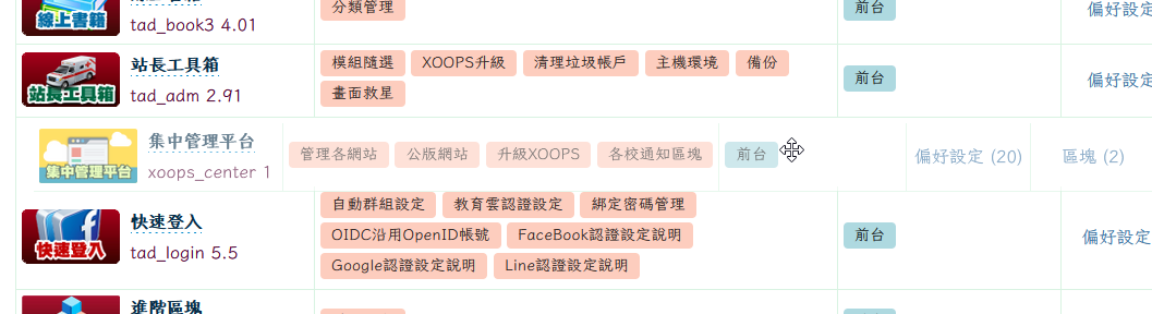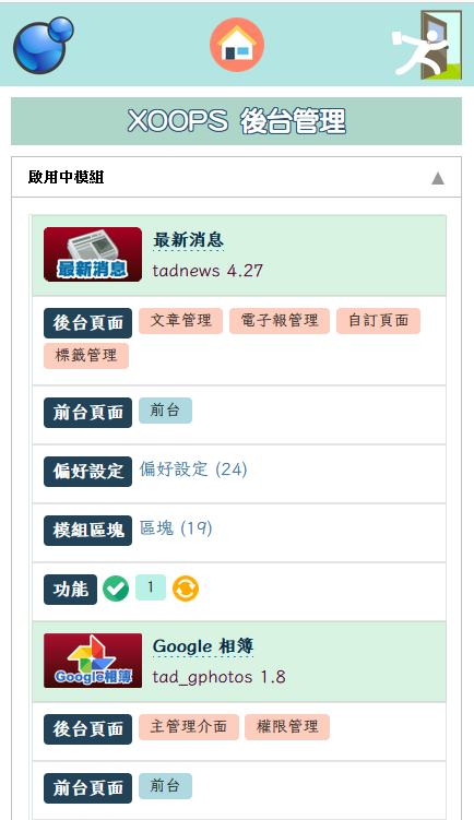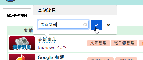 此後台大幅簡化原本的 Tad 後台,將所有的模組及其相關功能都一併以表格列出,一目了然,不用再點來點去到處找。甚至可以直接點擊修改模組名稱、拉動修改模組排序,或者輕鬆的開關或更新模組。