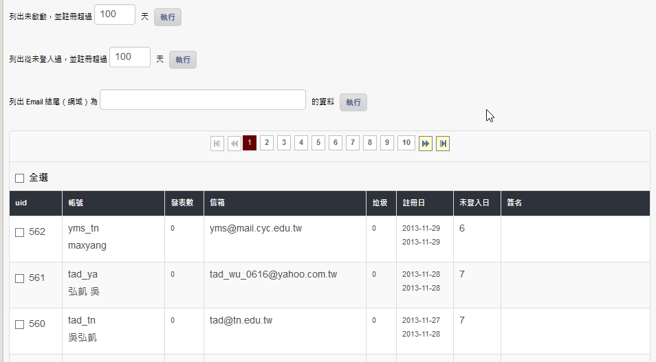 因為我快被一堆外國來的垃圾帳號煩死了!所以,寫了一個簡單的模組,用來檢查是否為垃圾帳號。若是,就可以殺無赦了!!本站利用它,砍了1400個左右的垃圾帳號...。未來,會逐步改寫成可以協助站長進一步偵錯或者進行網站急救用的模組。