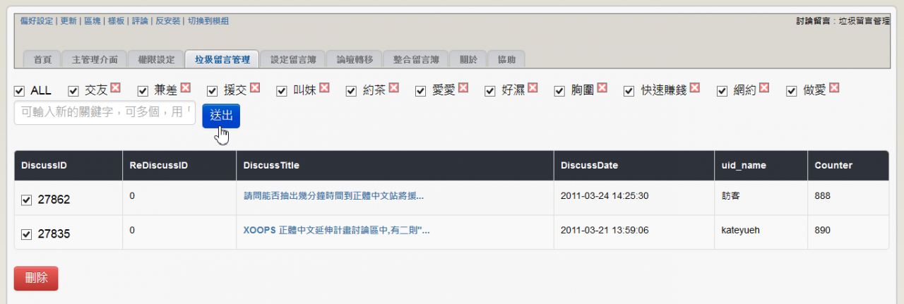 2. 垃圾留言加上取消全選及符合關鍵字的資訊